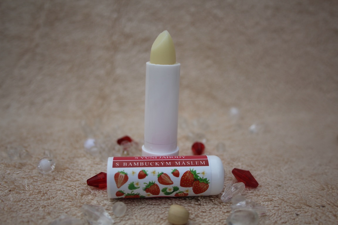 Balzám na rty s jahodovou vůní. Skvělý výživný balzám na rty z bambuckého másla s lákavou vůní jahod. Doporučujeme ke každodenní intenzivní péči o rty a jejich ochranu před nepříznivými vlivy počasí.