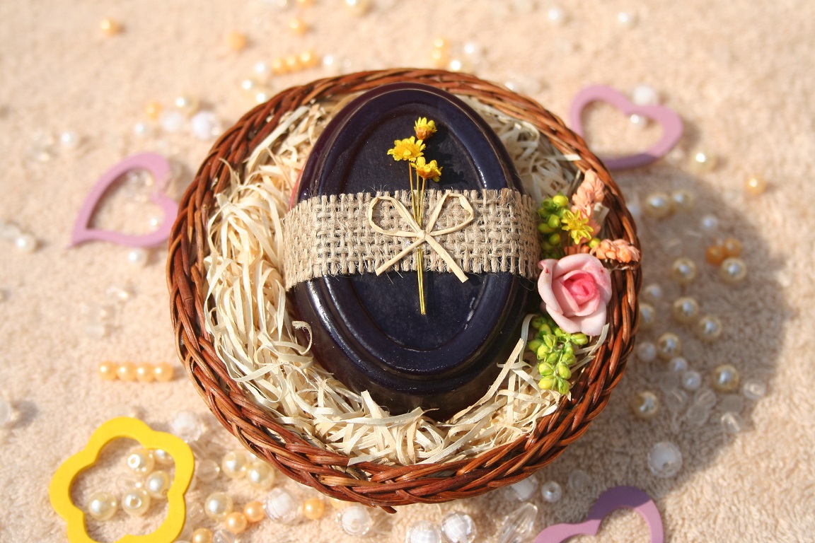 Dárkový košík s 1 glycerinovým mýdlem 90g v ovocné vůni černý hrozen. Glycerinové mýdlo je zdobené sušenou květinkou, košík je ozdoben přírodními materiály. Baleno ve fólii.