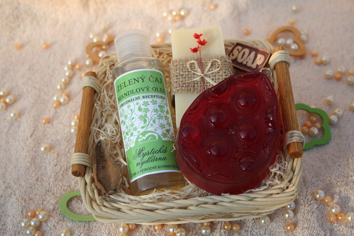 Podrobný popisKombinace přírodního olivového mýdla natural 90g, glycerinového mýdla s masážním efektem 100g (výstupky na mýdle) a mandlového oleje Zelený čaj 115ml. Dárkový košík je doplněn dekorací ze suchých materiálů. Baleno ve fólii.