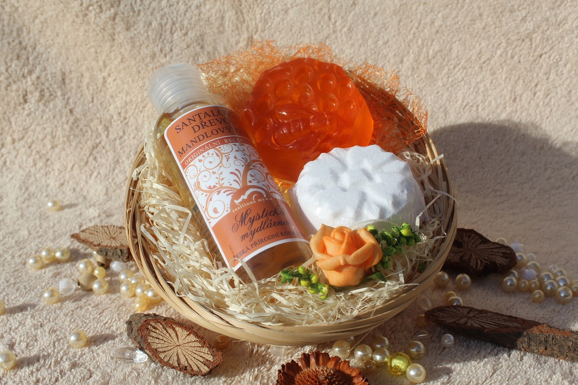 Dárkový košík s mandlovým olejem Santalové dřevo 110ml, šumivou koupelí 50g s vůní bílý čaj a glycerinovým mýdlem 70g. Baleno ve fólii.