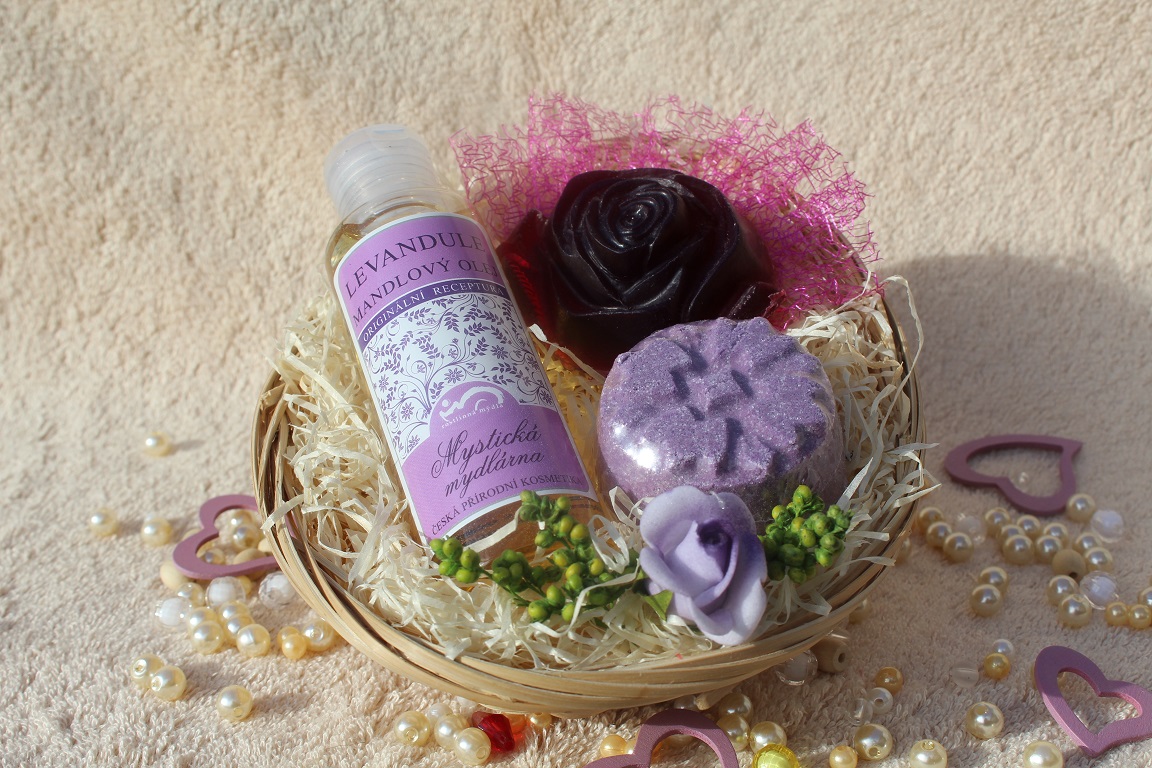 Dárkový košík s mandlovým olejem Levandule (115ml), šumivou koupelí (50g) s vůní levandule a glycerinovým mýdlem (35g) s ovocnou vůní černý hrozen.