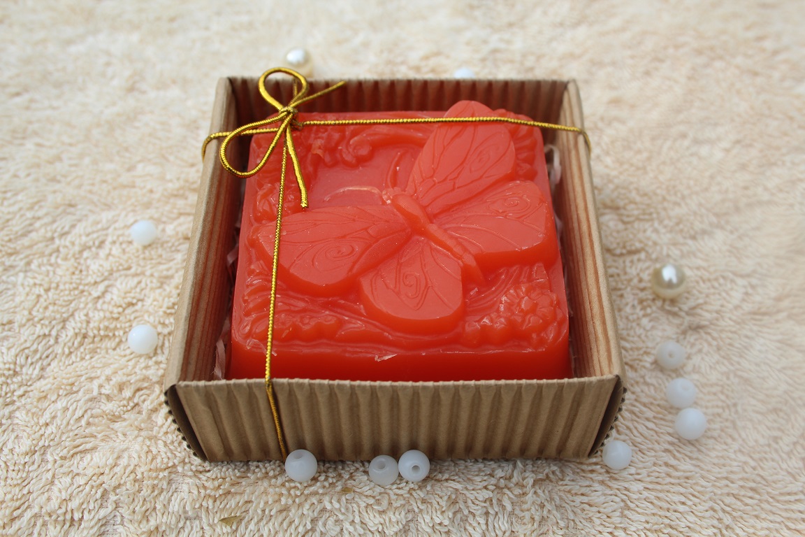 Glycerinové mýdlo s motýlkem 70g  v oranžové barvě s vůní pomeranč v dárkové krabičce z vlnité lepenky. Váha: 70g Baleno ve fólii.