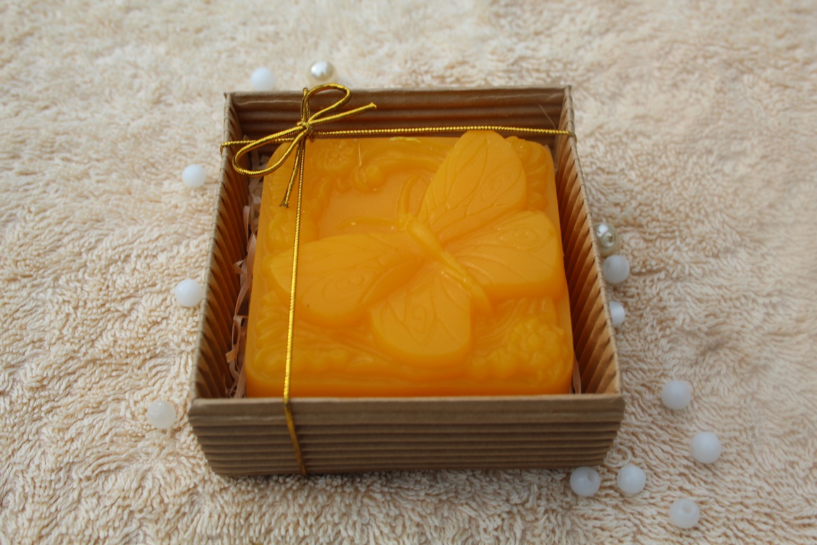 Glycerinové mýdlo s motýlkem 70g  v žluté barvě s citrusovou vůní litsea cubeba v dárkové krabičce z vlnité lepenky. Váha: 70g Baleno ve fólii.