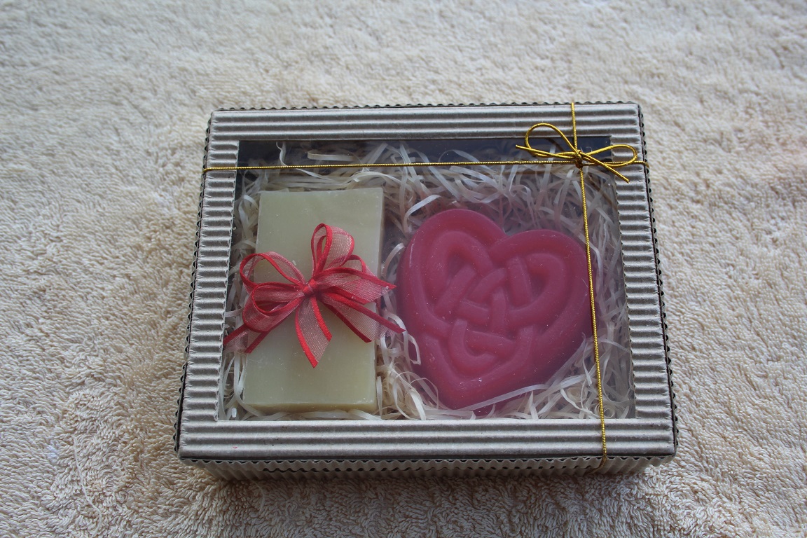 Glycerinové srdce v červené barvě s vůní borůvky 60g a přírodní olivové mýdlo natural 90g.